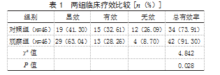 2.1两组临床疗效比较观察组治疗总有效率为91.30%,高于对照组的73.91%,差异有统计学意义(P<0.05)。见表1。