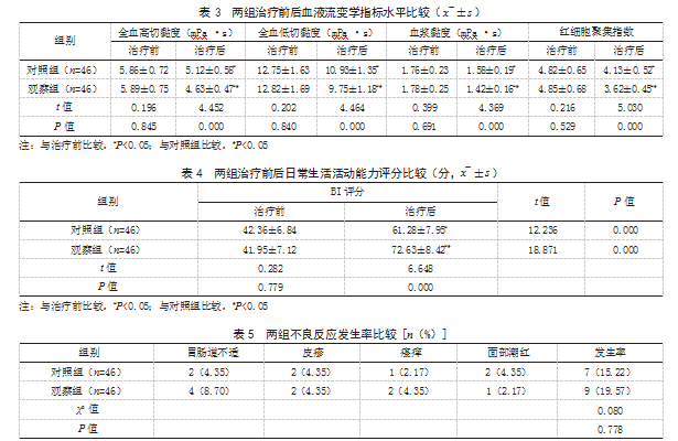 2.3两组治疗前后血液流变学指标水平比较治疗前,两组全血高切黏度、全血低切黏度、血浆黏度、红细胞聚集指数水平比较,差异均无统计学意义(P>0.05);治疗后,两组全血高切黏度、全血低切黏度、血浆黏度、红细胞聚集指数水平均低于治疗前,且观察组低于对照组,差异有统计学意义(P<0.05)。见表3。