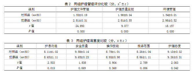 2.2两组护理管理评分比较观察组护理文件管理、护理质量监控、环境管理评分均高于对照组,差异有统计学意义(P<0.05)。见表2。