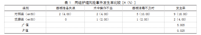 2.1两组护理风险事件发生率比较观察组护理风险事件发生率为4.00%(2/50),低于对照组的18.00%(9/50),差异有统计学意义(P<0.05)。见表1。