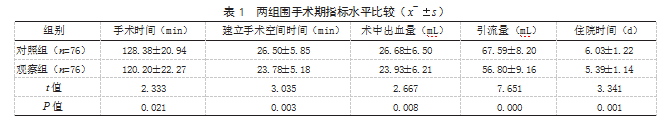 2.1两组围手术期指标水平比较观察组手术时间、建立手术空间时间及住院时间均短于对照组,术中出血量、引流量均少于对照组,差异有统计学意义(P<0.05)。见表1。