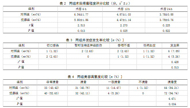 1.1一般资料选取2022—2023年于本院行腔镜甲状腺切除术的患者进行前瞻性研究。纳入标准:符合《甲状腺结节超声诊断规范》中的相关诊断标准[6];经超声检查确诊;良性结节;符合甲状腺切除术指征并择期接受治疗;单侧发病;首次手术,且对颈部有美观要求者。排除标准:既往有颈部放化疗史;合并凝血功能障碍或有血液系统疾病者;存在麻醉禁忌证。患者及家属对本研究内容了解并自愿签署知情同意书,且研究经本院伦理委员会批准(批准文号:LNUB-CC-27)。按照随机数字表法将其分为对照组和观察组各76例。对照组男28例,女48例;年龄28~67岁,平均(38.16±5.94)岁;结节直径25~47 mm,平均(38.30±5.66)mm;患侧:左侧40例,右侧36例。观察组男33例,女43例;年龄26~66岁,平均(37.26±6.59)岁;结节直径25~45 mm,平均(37.98±5.32)mm;患侧:左侧44例,右侧32例。两组一般资料比较,差异无统计学意义(P>0.05),有可比性。