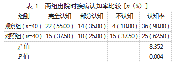 2.1两组出院时疾病认知率比较观察组疾病认知率为90.00%,高于对照组的62.50%,差异有统计学意义(P<0.05)。见表1。