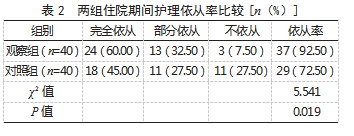 2.2两组住院期间护理依从率比较观察组护理依从率为92.50%,高于对照组的72.50%,差异有统计学意义(P<0.05)。见表2。