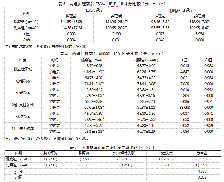 2.3两组护理前后ESCA、HPLP-Ⅱ评分比较护理前,两组ESCA、HPLP-Ⅱ评分比较,差异均无统计学意义(P>0.05);护理后,两组ESCA、HPLP-Ⅱ评分高于护理前,且观察组高于对照组,差异均有统计学意义(P<0.05)。见表3。