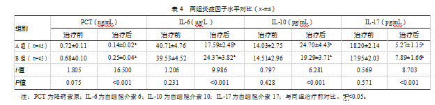 治疗后,对比B组,A组血清PCT、IL-6、IL-17水平更低,IL-10更高,差异均有统计学意义(P均<0.05)。见表4。