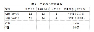 A组总有效率为97.78%,高于B组的80.00%,差异有统计学意义(P<0.05)。见表1。
