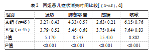 与B组相比,A组发热、肺部啰音、憋喘、咳嗽消失时间更短,差异均有统计学意义(P均<0.05)。见表2。