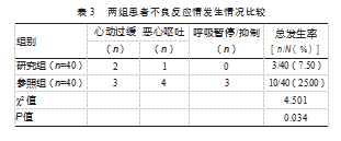 在临床针对小肠疾病患者实施诊断工作的过程中,小肠镜得到了广泛应用。特别是无痛小肠镜的开展具有显著特殊性,所需操作时间较长[7-8]。操作过程中,需要稳定患者的呼吸循环和血流动力学,还需要确保麻醉效果满意,避免系列不良反应的发生,所以探究有效的麻醉干预方法表现出显著价值[9-10]。在实施麻醉期间,易出现心动过缓、恶心呕吐、呼吸暂停/抑制等系列不良反应情况。就心动过缓情况,需要积极做好密切监测工作,对药物剂量实施合理调整,对于循环稳定给予充分维持;就恶心呕吐情况,需要积极做好术前准备工作,将麻醉方案充分优化,合理完成术后护理干预;对于呼吸暂停/抑制情况,需要对呼吸道通畅做出保障,合理展开辅助呼吸干预以及药物干预。