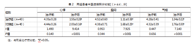②中医症候积分。自制量表评价,重点对心悸、胸闷、气短症候展开评测,结合症状严重程度分别赋值0分、2分、4分、6分,所测分数低,症状严重程度低。