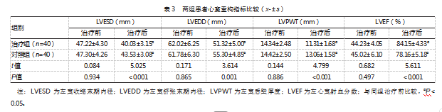 治疗后,治疗组LVESD、LVEDD小于对照组,LVPWT薄于对照组,LVEF高于对照组,差异均有统计学意义(P均<0.05)。见表3。