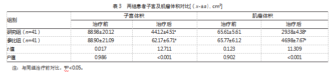 治疗后,两组子宫及肌瘤体积均小于同组治疗前,且研究组子宫及肌瘤体积小于参比组,差异均有统计学意义(P均<0.05)。见表3。