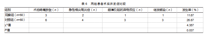 观察组根管恰填率高于对照组,差异有统计学意义(P<0.05)。见表4。