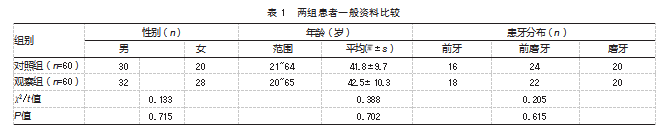 便利选取2022年1月—2023年12月五矿邯邢职工总医院口腔科收治的120例根尖周炎患者为研究对象,根据治疗方式不同分为观察组和对照组,各60例。两组患者一般资料对比,差异均无统计学意义(P均>0.05),具有可比性。见表1。本研究经五矿邯邢职工总医院伦理委员会审核批准(2025-KY-HY-18)。