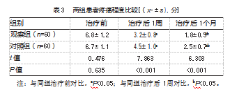 治疗后1周、治疗后1个月,观察组患者VAS评分均低于对照组,差异均有统计学意义(P均<0.05)。见表3。