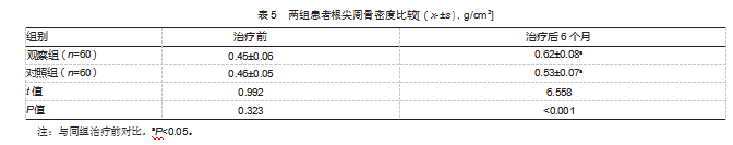 治疗后6个月,观察组根尖周骨密度高于对照组,差异有统计学意义(P<0.05)。见表5。