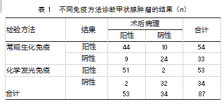 87例患者经病理检查显示53例为甲状腺肿瘤。化学发光免疫灵敏度、特异度、阳性预测值、阴性预测值、准确度高于常规生化免疫,差异均有统计学意义(P均<0.05)。见表1、表2。