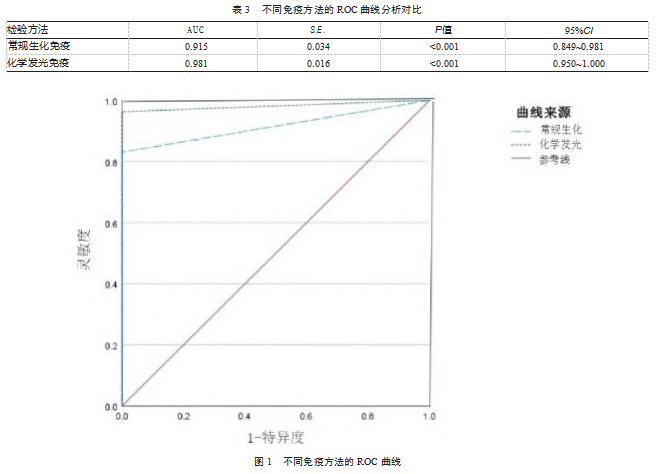 化学发光免疫检验的AUC为0.981(95%CI:0.950~1.000),高于常规生化免疫检验的0.915(95%CI:0.849~0.981)。见表3、图1。