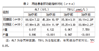 观察组肝功能指标(ALT、TBIL)改善程度优于对照组,差异均有统计学意义(P均<0.05)。见表2。