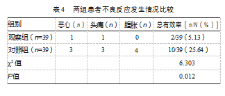 观察组不良反应发生率低于对照组,差异有统计学意义(χ2=6.303,P<0.05)。见表4。