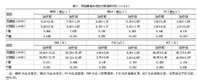 观察组血流动力学指标(WBHR、WBLR、PV、PAR、FIB、HCT)改善程度优于对照组,差异均有统计学意义(P均<0.05)。见表3。