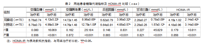 2.2两组患者糖脂代谢指标及HOMA-IR比较