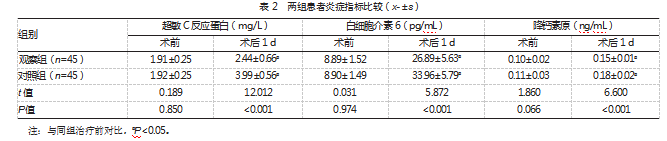 两组患者术前炎症指标比较,差异均无统计学意义(P均>0.05)。术后1 d,两组患者的超敏C反应蛋白、白细胞介素6及降钙素原水平均较术前升高,但观察组上升幅度低于对照组,差异均有统计学意义(P均<0.05)。见表2。