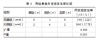 观察组并发症发生率低于对照组,差异有统计学意义(P<0.05)。见表4。
