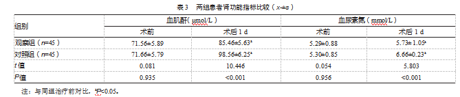 两组患者术前肾功能指标比较,差异均无统计学意义(P均>0.05)。术后1 d,两组患者的血肌酐、血尿素氮水平均较术前升高,但观察组上升幅度低于对照组,差异均有统计学意义(P均<0.05)。见表3。