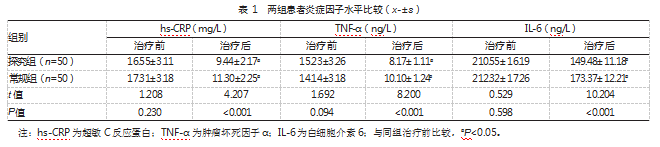 治疗后,探究组炎症因子水平低于常规组,差异均有统计学意义(P均<0.05)。见表1。