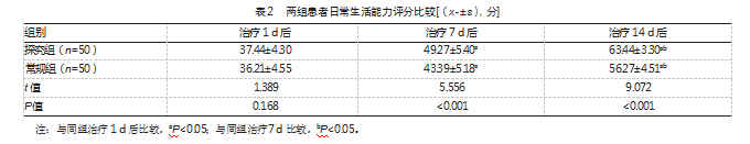 治疗7、14 d后,探究组日常生活能力优于常规组,差异均有统计学意义(P均<0.05)。见表2。