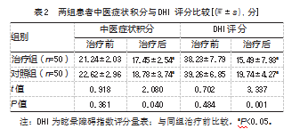 治疗后,治疗组在中医症状积分与DHI评分均低于对照组,差异均有统计学意义(P均<0.05)。见表2。