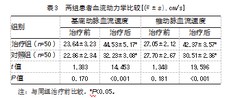 治疗后,两组基底动脉与椎动脉血流速度均较治疗前有所提升,且治疗组基底动脉与椎动脉血流速度高于对照组,差异均有统计学意义(P均<0.05)。见表3。