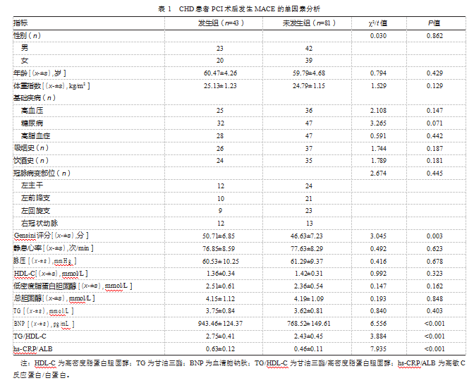 2.1 CHD患者PCI术后发生MACE的单因素分析