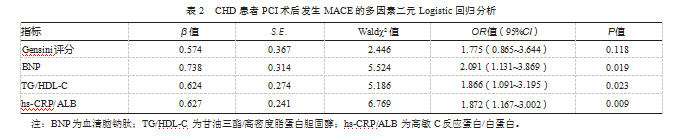 2.2 CHD患者PCI术后发生MACE的多因素二元Logistic回归分析
