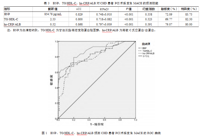 血清 BNP、TG/HDL-C、hs-CRP/ALB 预测冠状动脉粥样硬化性心脏病患者发生 MACE 的价值论文