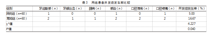 ③并发症。统计两组牙齿敏感、牙龈出血、龋病、感染、口腔溃疡、口腔疼痛发生情况。并发症发生率=并发症发生例数/总例数×100%。