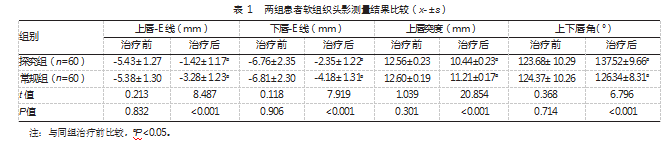 治疗后,探究组软组织头影测量结果优于常规组,差异均有统计学意义(P均<0.05)。见表1。
