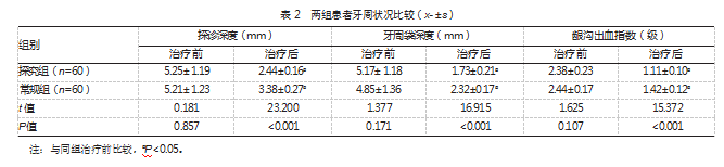 治疗后,探究组探诊深度、牙周袋深度、龈沟出血指数优于常规组,差异均有统计学意义(P均<0.05)。见表2。