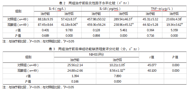 2.2两组治疗前后炎性因子水平比较治疗前,两组IL-6、IL-18、TNF-α水平比较,差异均无统计学意义(P>0.05);治疗后,两组IL-6、IL-18、TNF-α水平均低于治疗前,且观察组低于对照组,差异有统计学意义(P<0.05)。见表2。