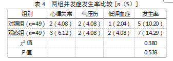 2.4两组并发症发生率比较观察组并发症发生率为14.29%(7/49),对照组并发症发生率为10.20%(5/49),两组并发症发生率比较,差异无统计学意义(P>0.05)。见表4。