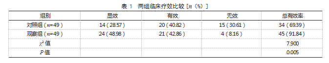 2.1两组临床疗效比较观察组治疗总有效率为91.84%(45/49),高于对照组的69.39%(34/49),差异有统计学意义(P<0.05)。见表1。