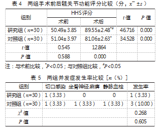 2.4两组手术前后髋关节功能评分比较术前,两组HHS评分比较,差异无统计学意义(P>0.05);术后,两组HHS评分均高于术前,且研究组高于对照组,差异有统计学意义(P<0.05)。见表4。