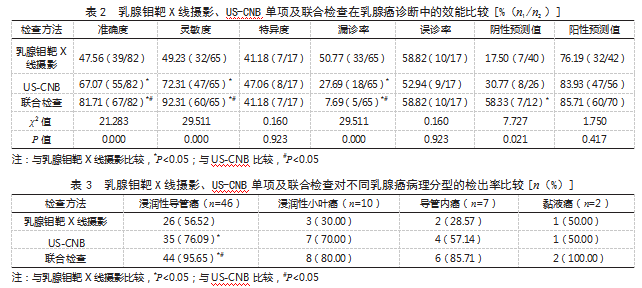 本研究结果还显示,乳腺钼靶X线摄影联合US-CNB检查对浸润性导管癌的检出率高于二者单项检查。分析原因为浸润性导管癌表现为肿块内部有钙化灶,乳腺钼靶X线摄影联合US-CNB检查可提高对微小钙化灶的诊断准确度。因本研究纳入样本量较少,其结果尚需后续增加样本量、开展深入研究予以印证。