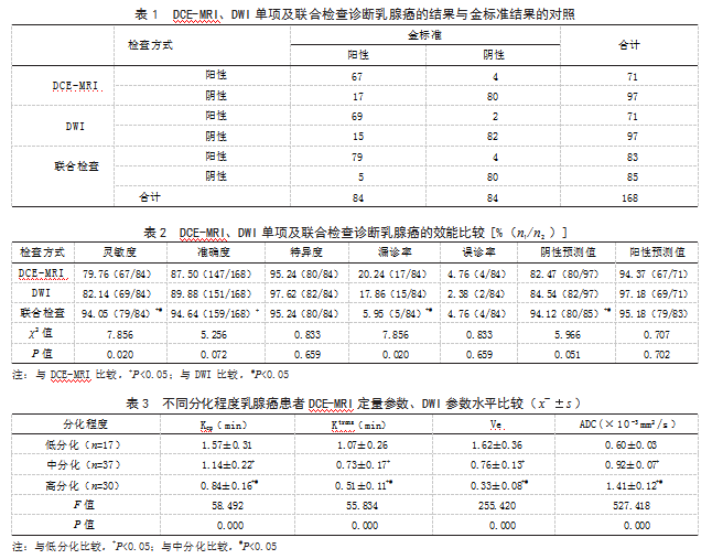 2.2 DCE-MRI、DWI单项及联合检查诊断乳腺癌的结果DCE-MRI检查结果显示,阳性71例,阴性97例;DWI检查结果显示,阳性71例,阴性97例;联合检查结果显示,阳性83例,阴性85例。见表1。