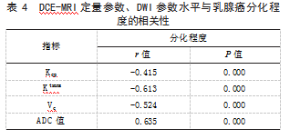 2.5 DCE-MRI定量参数、DWI参数水平与乳腺癌分化程度的相关性经Spearman相关性分析结果显示,Kep、Ktrans、Ve水平与乳腺癌分化程度均呈负相关(r<0,P<0.05),ADC值与乳腺癌分化程度呈正相关(r>0,P<0.05)。见表4。