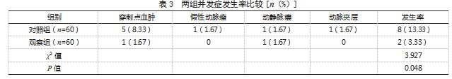 2.1两组穿刺成功率、造影成功率比较观察组穿刺成功率、造影成功率分别为98.33%、98.33%,对照组穿刺成功率、造影成功率分别为93.33%、91.67%,两组穿刺成功率、造影成功率比较,差异均无统计学意义(P>0.05)。见表1。