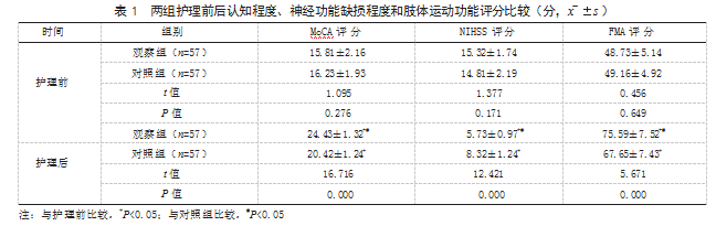 2.1两组护理前后认知程度、神经功能缺损程度和运动功能评分比较护理前,两组MoCA、NIHSS、FMA评分比较,差异均无统计学意义(P>0.05);护理后,两组MoCA、FMA评分均高于护理前,且观察组高于对照组,两组NIHSS评分均低于护理前,且观察组低于对照组,差异有统计学意义(P<0.05)。见表1。