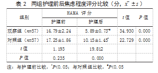 2.2两组护理前后焦虑程度评分比较护理前,两组HAMA评分比较,差异无统计学意义(P>0.05);护理后,两组HAMA评分均低于护理前,且观察组低于对照组,差异有统计学意义(P<0.05)。见表2。