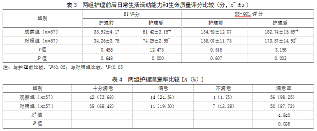 2.3两组护理前后日常生活活动能力和生命质量评分比较护理前,两组BI、SS-QOL评分比较,差异均无统计学意义(P>0.05);护理后,两组BI、SS-QOL评分均高于护理前,且观察组高于对照组,差异有统计学意义(P<0.05)。见表3。